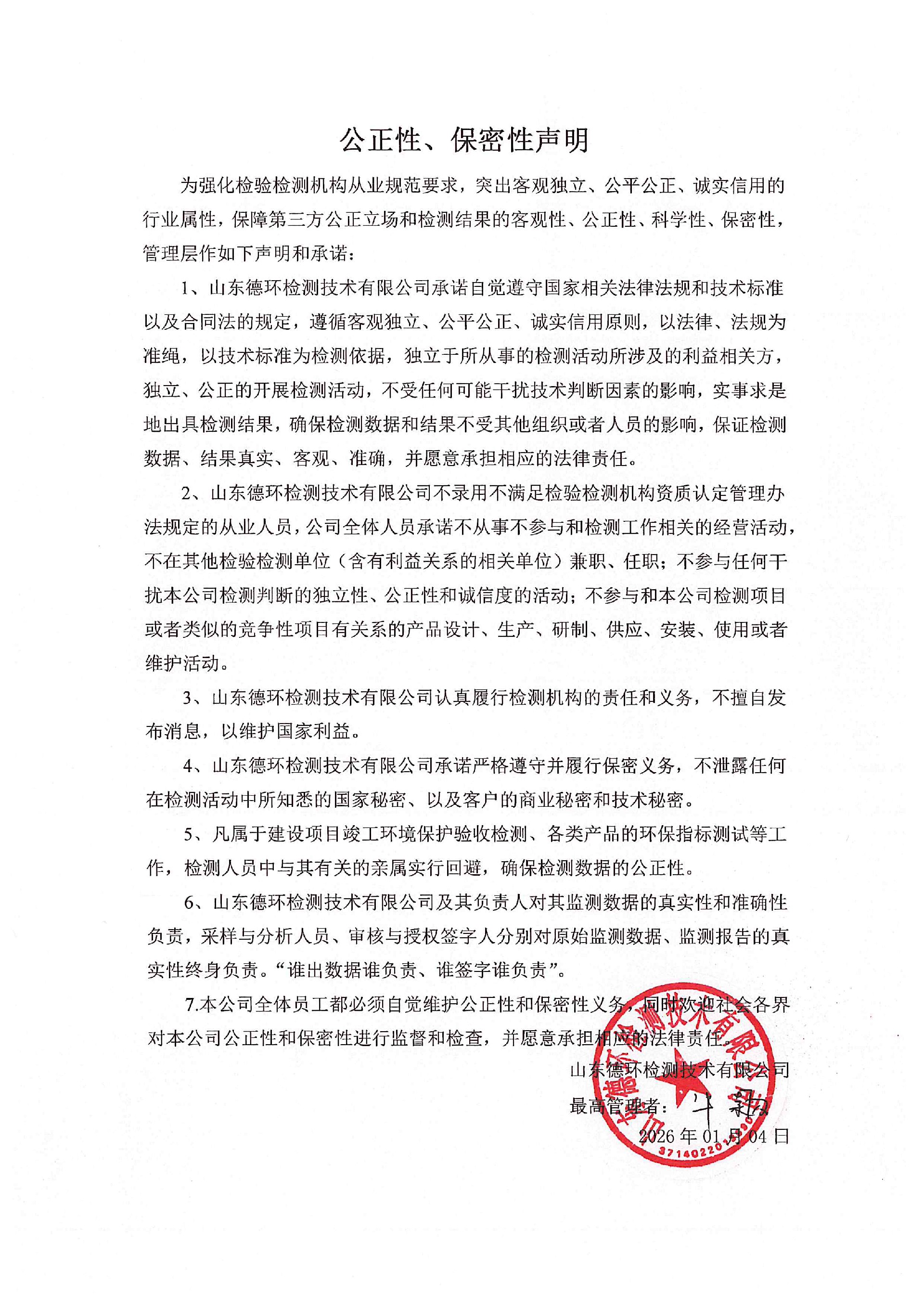 為強(qiáng)化檢驗(yàn)檢測(cè)機(jī)構(gòu)從業(yè)規(guī)范要求,突出客觀獨(dú)立、公平公正、誠(chéng)實(shí)信用的行業(yè)屬性,保障第三方公正立場(chǎng)和檢測(cè)結(jié)果的客觀性、公正性、科學(xué)性、保密性,管理層作如下聲明和承諾: 1、山東德環(huán)檢測(cè)技術(shù)有限公司承諾自覺遵守國(guó)家相關(guān)法律法規(guī)和技術(shù)標(biāo)準(zhǔn)以及合同法的規(guī)定,遵循客觀獨(dú)立、公平公正、誠(chéng)實(shí)信用原則,以法律、法規(guī)為準(zhǔn)繩,以技術(shù)標(biāo)準(zhǔn)為檢測(cè)依據(jù),獨(dú)立于所從事的檢測(cè)活動(dòng)所涉及的利益相關(guān)方,獨(dú)立、公正的開展檢測(cè)活動(dòng),不受任何可能干擾技術(shù)判斷因素的影響,實(shí)事求是地出具檢測(cè)結(jié)果,確保檢測(cè)數(shù)據(jù)和結(jié)果不受其他組織或者人員的影響,保證檢測(cè)數(shù)據(jù)、結(jié)果真實(shí)、客觀、準(zhǔn)確,并愿意承擔(dān)相應(yīng)的法律責(zé)任。 2、山東德環(huán)檢測(cè)技術(shù)有限公司不錄用不滿足檢驗(yàn)檢測(cè)機(jī)構(gòu)資質(zhì)認(rèn)定管理辦法規(guī)定的從業(yè)人員,公司全體人員承諾不從事不參與和檢測(cè)工作相關(guān)的經(jīng)營(yíng)活動(dòng),不在其他檢驗(yàn)檢測(cè)單位(含有利益關(guān)系的相關(guān)單位)兼職、任職;不參與任何干擾本公司檢測(cè)判斷的獨(dú)立性、公正性和誠(chéng)信度的活動(dòng);不參與和本公司檢測(cè)項(xiàng)目或者類似的競(jìng)爭(zhēng)性項(xiàng)目有關(guān)系的產(chǎn)品設(shè)計(jì)、生產(chǎn)、研制、供應(yīng)、安裝、使用或者維護(hù)活動(dòng)。 3、山東德環(huán)檢測(cè)技術(shù)有限公司認(rèn)真履行檢測(cè)機(jī)構(gòu)的責(zé)任和義務(wù),不擅自發(fā)布消息,以維護(hù)國(guó)家利益。 4、山東德環(huán)檢測(cè)技術(shù)有限公司承諾嚴(yán)格遵守并履行保密義務(wù),不泄露任何在檢測(cè)活動(dòng)中所知悉的國(guó)家秘密、以及客戶的商業(yè)秘密和技術(shù)秘密。 5、凡屬于建設(shè)項(xiàng)目竣工環(huán)境保護(hù)驗(yàn)收檢測(cè)、各類產(chǎn)品的環(huán)保指標(biāo)測(cè)試等工作,檢測(cè)人員中與其有關(guān)的親屬實(shí)行回避,確保檢測(cè)數(shù)據(jù)的公正性。 6、山東德環(huán)檢測(cè)技術(shù)有限公司及其負(fù)責(zé)人對(duì)其監(jiān)測(cè)數(shù)據(jù)的真實(shí)性和準(zhǔn)確性負(fù)責(zé),采樣與分析人員、審核與授權(quán)簽字人分別對(duì)原始監(jiān)測(cè)數(shù)據(jù)、監(jiān)測(cè)報(bào)告的真實(shí)性終身負(fù)責(zé)?!罢l出數(shù)據(jù)誰負(fù)責(zé)、誰簽字誰負(fù)責(zé)”。 7.本公司全體員工都必須自覺維護(hù)公正性和保密性義務(wù),同時(shí)歡迎社會(huì)各界對(duì)本公司公正性和保密性進(jìn)行監(jiān)督和檢查,并愿意承擔(dān)相應(yīng)的法律責(zé)任。 山東德環(huán)檢測(cè)技術(shù)有限公司 2026年01月04日 微信圖片_20260104090332.jpg