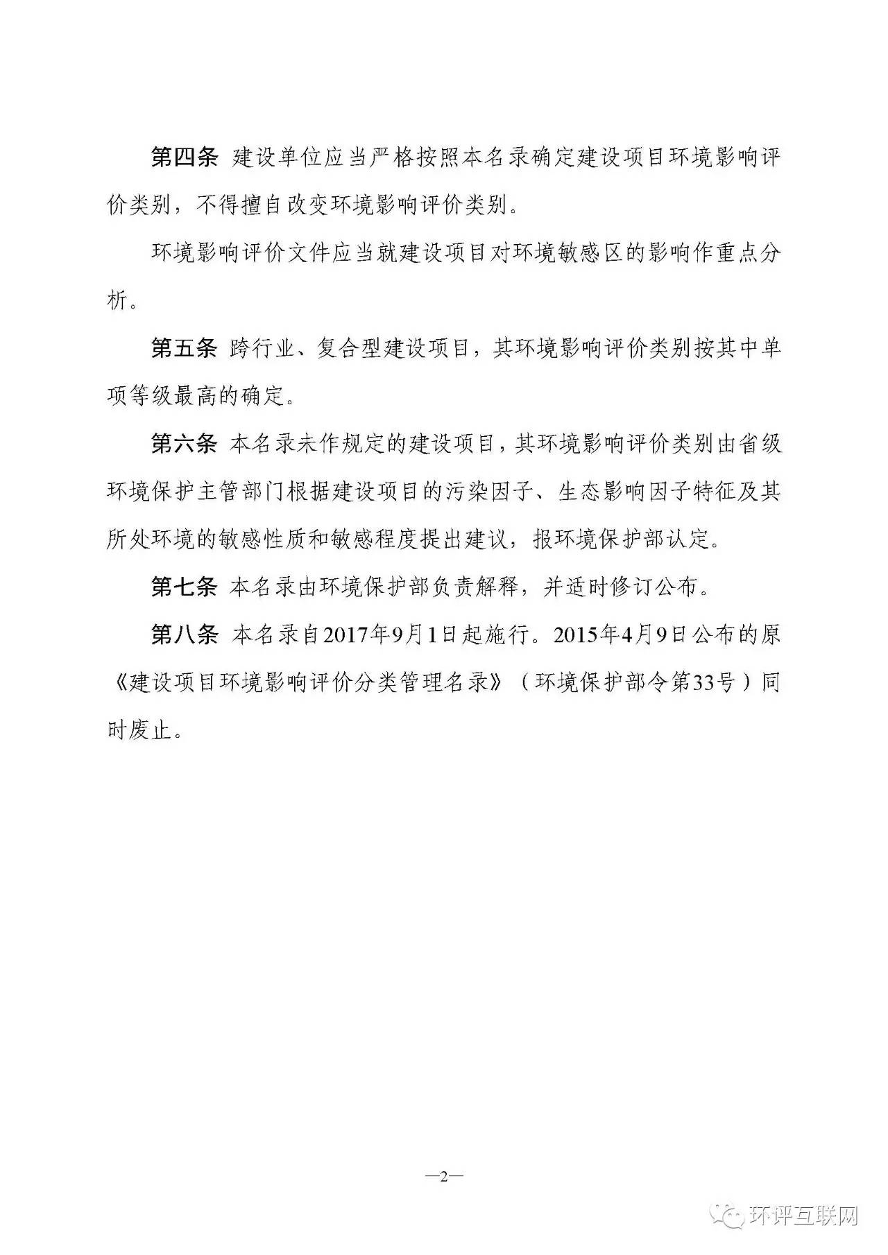 第八條 本名錄自2017年9月1日起施行。2015年4月9日公布的原《建設(shè)項(xiàng)目環(huán)境影響評價(jià)分類管理名錄》(環(huán)境保護(hù)部令第33號)同時(shí)廢止。