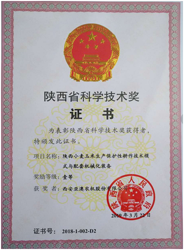 日前,全省科技創(chuàng)新大會暨科學(xué)技術(shù)獎勵大會在西安隆重召開,省委書記胡和平出席會議并講話,省長劉國中主持會議,會議表彰了2018年度省科學(xué)技術(shù)獎獲獎項目,并向最高成就獎及一等獎獲獎?wù)哳C發(fā)了獎勵證書。亞澳農(nóng)機和西北農(nóng)林科技大學(xué)合作研發(fā)的“陜西小麥玉米生產(chǎn)保護性耕作技術(shù)模式與配套機械化裝備”項目成果榮獲省科技進步一等獎。